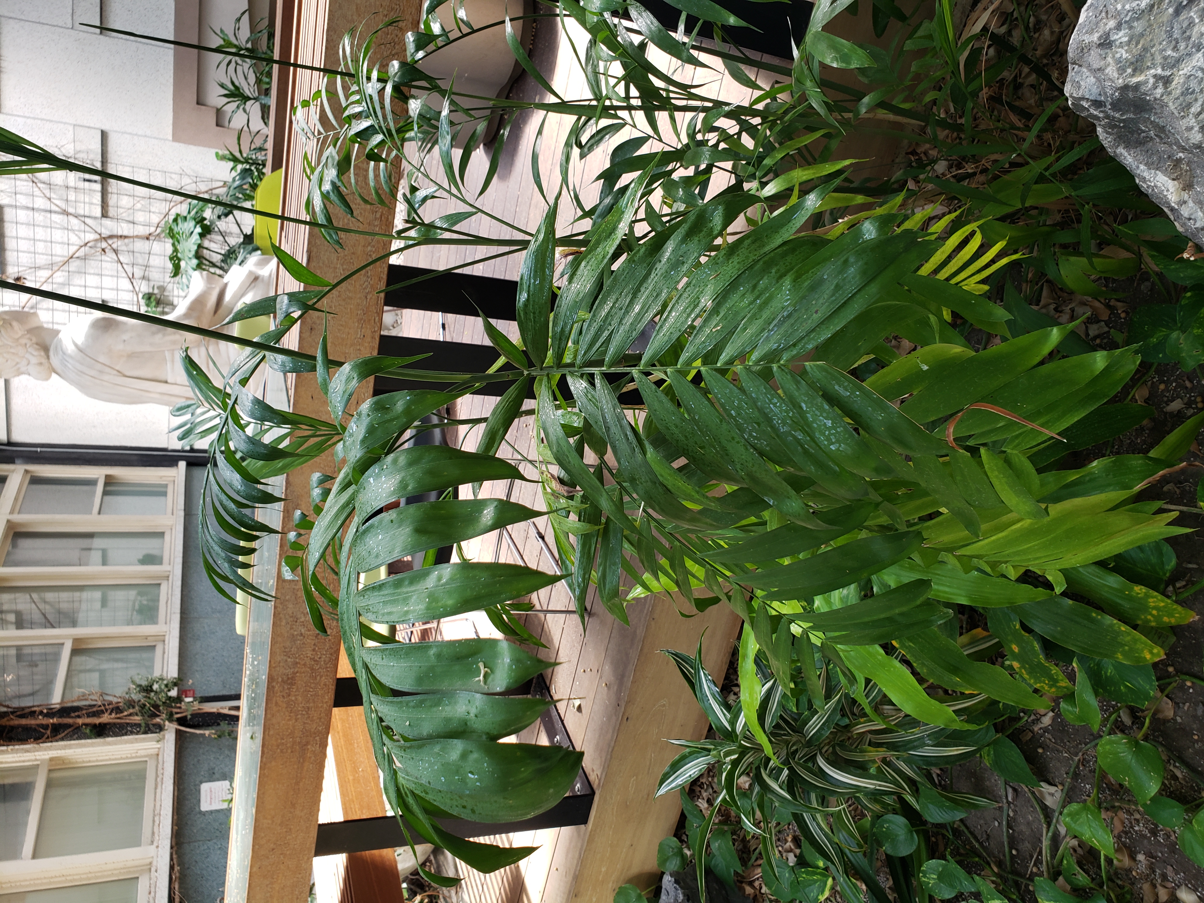 It is often cultivated in temperate regions as a houseplant and in gardens in Southeastern United States, where it grows to 2 m (6 ft 7 in) tall with very slow growth. It is most-often planted and sold in batches of 5-30 seedlings. Over time, a few emergent plants begin to dominate as the weaker/smaller seedlings are crowded out for light and eventually die, leaving within a few years of purchase a few survivors which develop stems and can live for many decades in a pot. It tolerates low levels of humidity and light, though it prefers medium to high humidity and bright indirect light. Chamaedorea elegans is intolerant of frost and must be kept indoors in winter in non-tropical climates. https://en.wikipedia.org/wiki/Chamaedorea_elegans